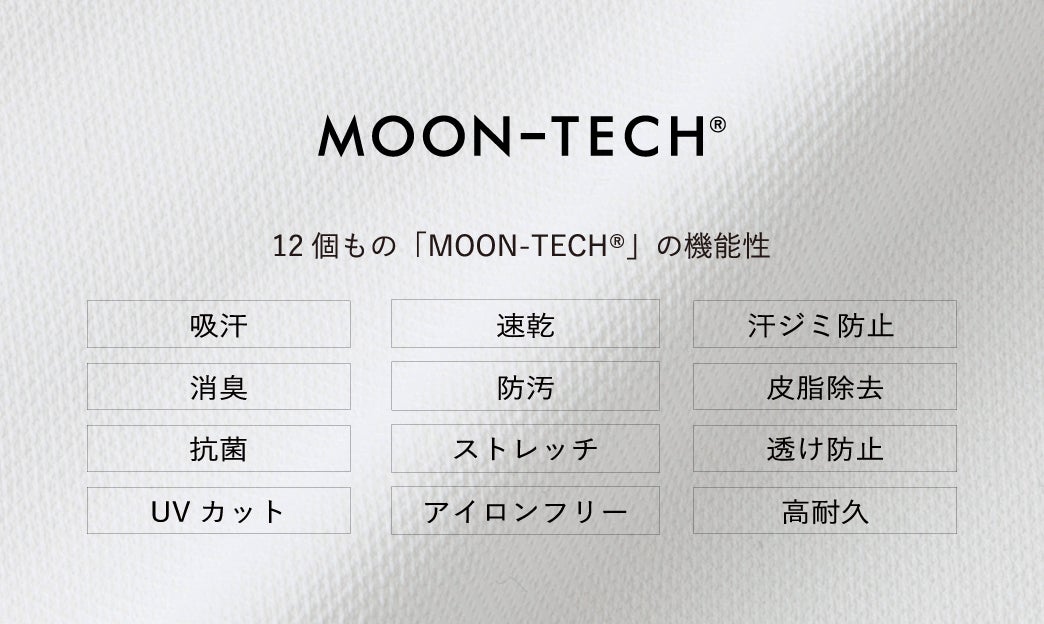 「MOON-TECH®」は、東レの先端素材「フィールドセンサー®EX」をベースに、長期間の閉鎖された環境となる宇宙ステーションでの快適な生活のために開発されたJAXA・東レ共同開発宇宙技術など12個におよぶ「過剰なほどの機能性」を高いレベルで搭載した最新の先端素材です。
